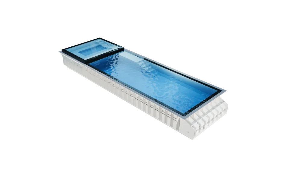 - Sisältää sisäänrakennetut lamelliverhot ylimitoitetun rannan alla – rantavyöhykkeellä on sisäänrakennetut portaat