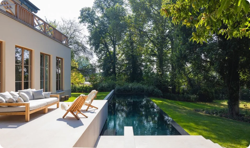Tavallisten ylivuotoreunojen ja infinity-ylivuotojen yhdistelmä teki tästä kaupunkipuutarhaprojektista varsin ainutlaatuisen. Kivipäällyste viimeistelee kokonaisuuden ja tekee siitä uniikin.- Erikoisvalmisteinen uima-allas, jossa yhdistelmä tavallista ja infinity-ylivuotoa