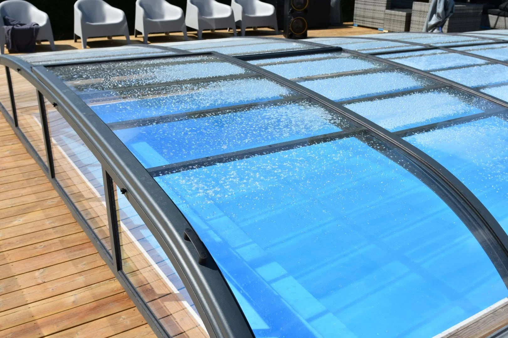 Pooltaket har starka aluminiumprofiler som håller barn och djur borta från poolområdet. Poolhöljet är en låg modell utrustad med okrossbar solid polykarbonat (klar plast) och antracit/anodiserade aluminiumprofiler.