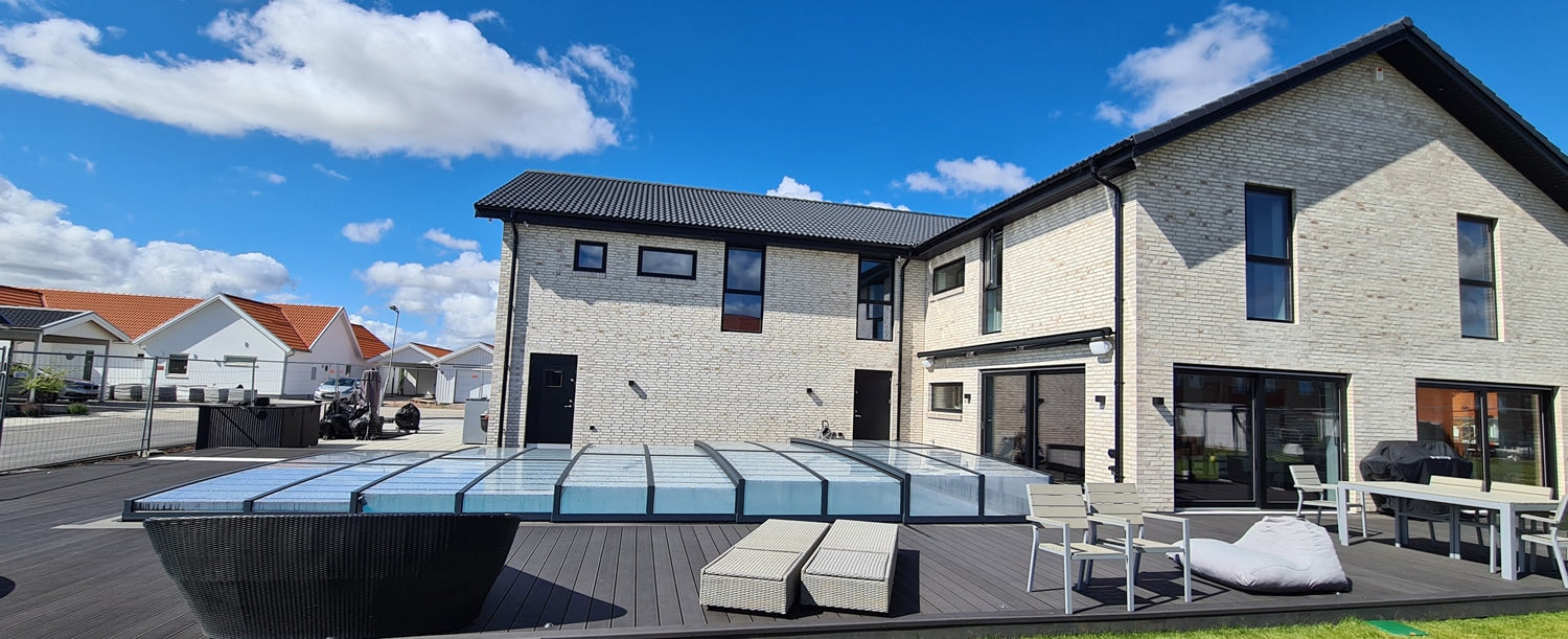 Matala uima-altaan suojus selkeällä polykarbonaattilasilla ja antrasiitinvärisillä pulverimaalatuilla alumiiniprofiileilla.