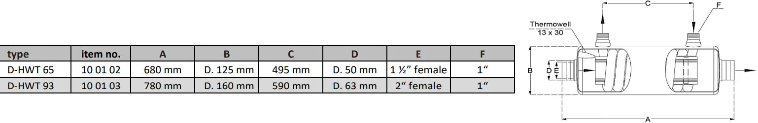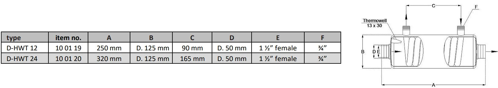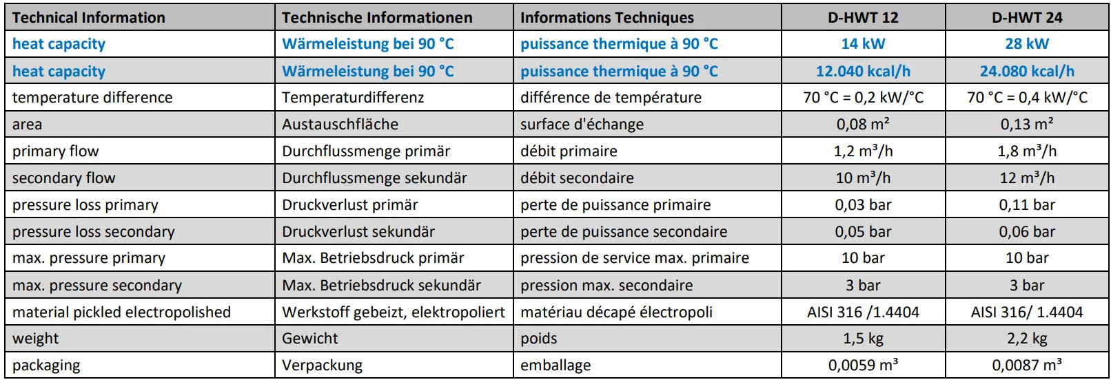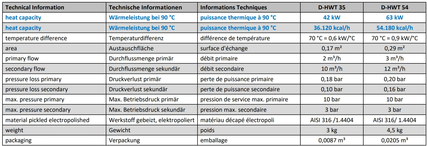 Vesi/vesi-lämmönvaihdin, jossa on sileät kierretyt putket poikittaisvirtauksella, sisäkuorella ja ohjauslevyllä optimaalista primäärienergianottoa varten (D-HWT 35) tai ilman sisäkuoren ohjauslevyä (D-HWT 54), huippuluokan hitsaus ja ensiluokkainen työstö. Laitteen käyttöikä on taattu materiaalin jälkikäsittelyn ansiosta värjäyksellä, passivoinnilla ja ulkoisella elektropolymeroinnilla. Nämä lämmönvaihtimet tarjoavat maksimaalisen energiatehokkuuden minimipainetappioilla. Kuten kaikki kierretyt putkilämmönvaihtimet, ne on integroitava suoraan uima-altaaseen tai ohitusjärjestelmän kautta.