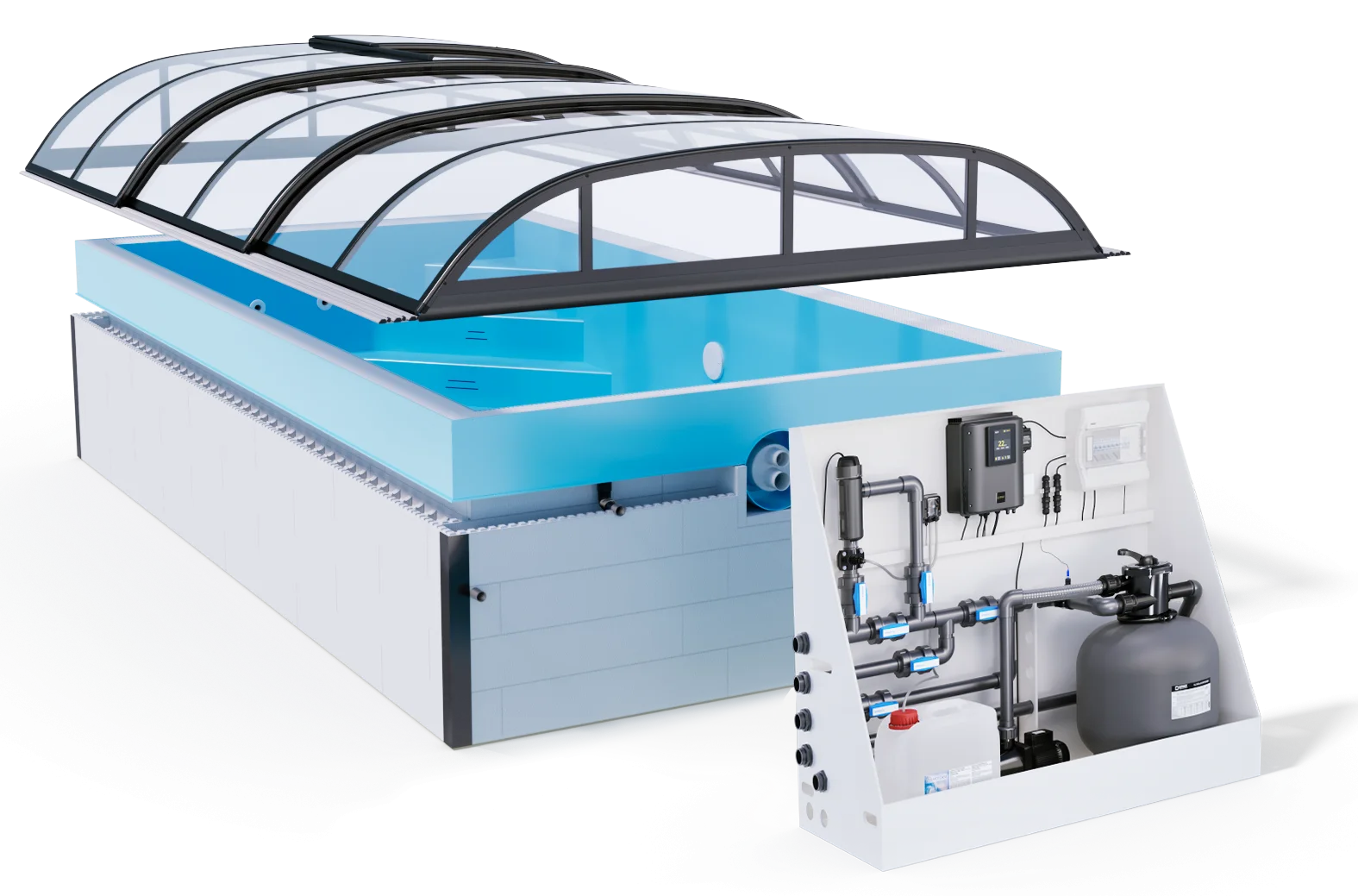 Allas toimitetaan "kokonaissaaveena", jossa ylivuotoura, sisäänotot, valot ja putket ovat valmiiksi asennettuja, ja polystyreeniblokit on jo kiinnitetty altaaseen. Aseta allas valettuun laattaan, vahvista allas ja tue sisäseinä aivan kuten thermopoolissa, jonka jälkeen voit täyttää altaan vedellä samalla kun valat seinät. Nopea asennus ja laadukkaat materiaalit yhdessä!