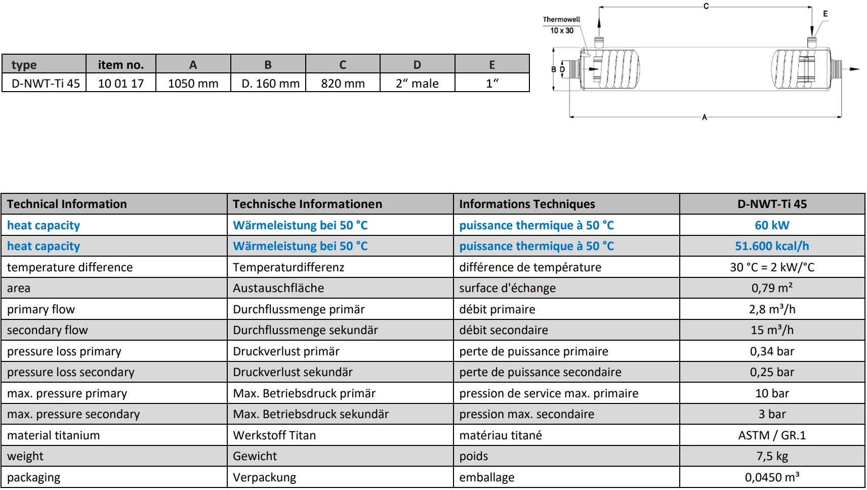 Vand/vand-varmevekslere, behandlet med sædvanlig førsteklasses håndværk og omhu, state-of-the-art svejsning. Denne førsteklasses varmeveksler har kompromisløs korrosionsbestandighed, selv ved høje saltniveauer i poolvand, og er derfor saltvandstæt. Disse varmevekslere tilbyder maksimal energieffektivitet ved minimalt tryktab. Som alle rørvarmevekslere skal de integreres i swimmingpoolens vandkredsløb enten direkte eller via bypass-systemet.